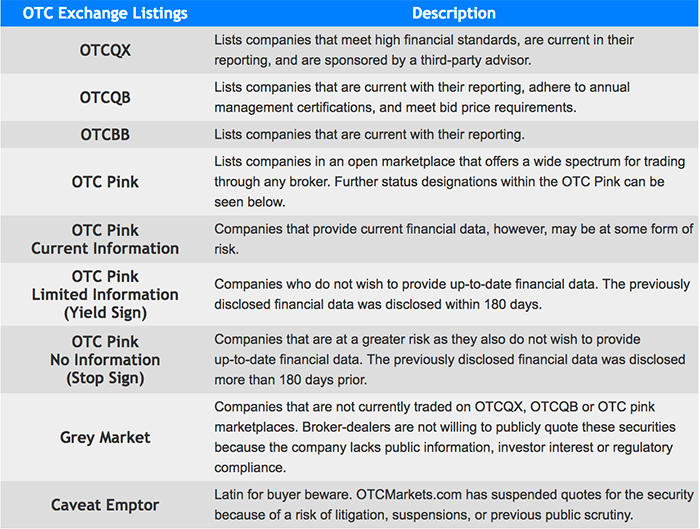 There are two markets that aren’t considered listed exchanges: the Over-the-Counter Bulletin Board (OTCBB) and OTC Markets. The OTCBB and OTC Markets list small and micro-cap companies that are publicly traded and classify the companies into eight separate tiers. The tiers are based on a company’s dependability, constancy of market volume and share price as follows: